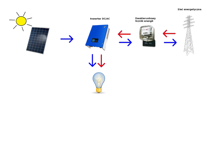 Instalacja podłączona do sieci (on-grid) - w tym typie instalacji energia elektryczna z modułów fotowoltaicznych w postaci prądu stałego jest zamieniana przez falownik na prąd przemienny o odpowiednich parametrach i następnie wykorzystywana na potrzeby pracy urządzeń domowych. Nadwyżki energii sprzedawane są do sieci energetycznej.
