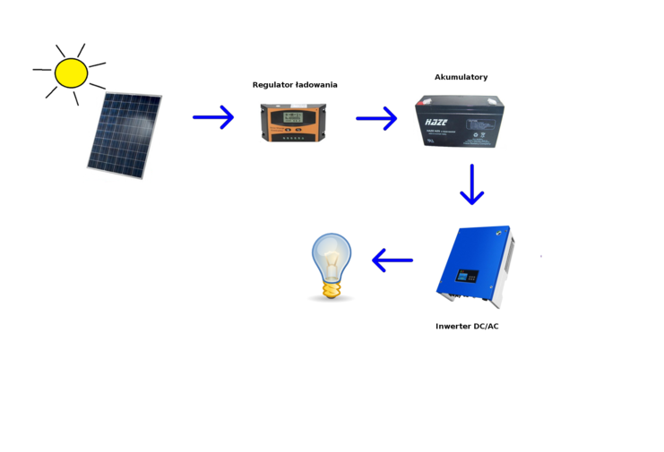Instalacja wyspowa (off-grid) - w tym typie instalacji energia elektryczna z modułów fotowoltaicznych w postaci prądu stałego jest zmieniana przez falownik na prąd przemienny o odpowiednich parametrach i następnie wykorzystywana na potrzeby pracy urządzeń domowych. Nadwyżki energii poprzez regulator wykorzystywane są do ładowania akumulatorów w celu późniejszego wykorzystania zgromadzonej energii.